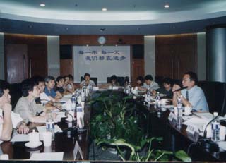 评审组成员在听联想集团柳传志总裁做企业状况报告 |